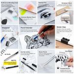 Entre os acessórios estão lápis blender incolor, caneta pincel para aquarela, pincel, bastões de carvão, bastões pastel coloridos, borrachas, apontadores metálico e plástico, estilete artístico, bloco de lixa, esfuminhos de papel, esponja blender e clipes metálicos. Esses itens apoiam etapas de mistura, correção, texturização e finalização do desenho.