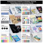 O conjunto inclui lápis específicos para esboço, sombreamento, coloração em camadas e mistura, com opções de grafite comum e grafite integral (sem madeira), além de carvão preto, carvão branco e lápis pastel. A variedade de tipos de mina permite desde linhas finas e detalhadas até áreas de cor sólida, efeitos de luz e transições suaves.