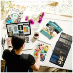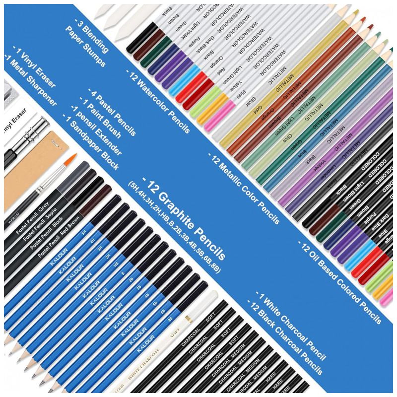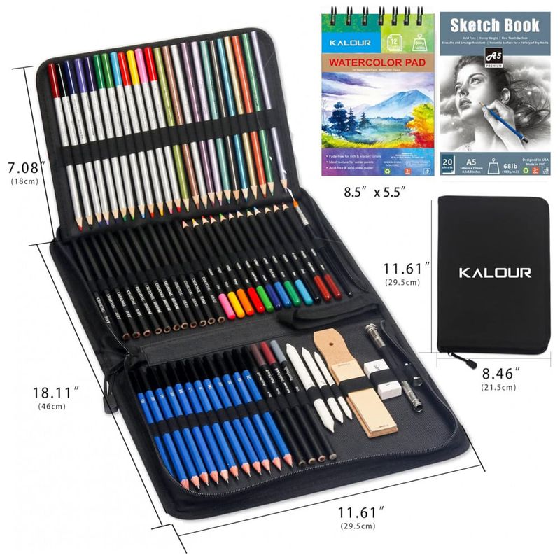 Este kit de desenho e esboço KALOUR com 76 peças reúne diferentes tipos de lápis artísticos, acessórios e blocos de papel para desenho seco e aquarela em um único conjunto portátil. A seleção foi desenvolvida para estudos de sketch, coloração, sombreamento e misturas em nível iniciante e intermediário.