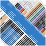 O conjunto inclui lápis grafite para esboço, lápis de carvão, lápis de cor, lápis aquareláveis, metálicos, pastel e carvão branco, todos com identificação de cor por nome e número. As minas foram projetadas para traço consistente, boa deposição de pigmento e resistência moderada à quebra.