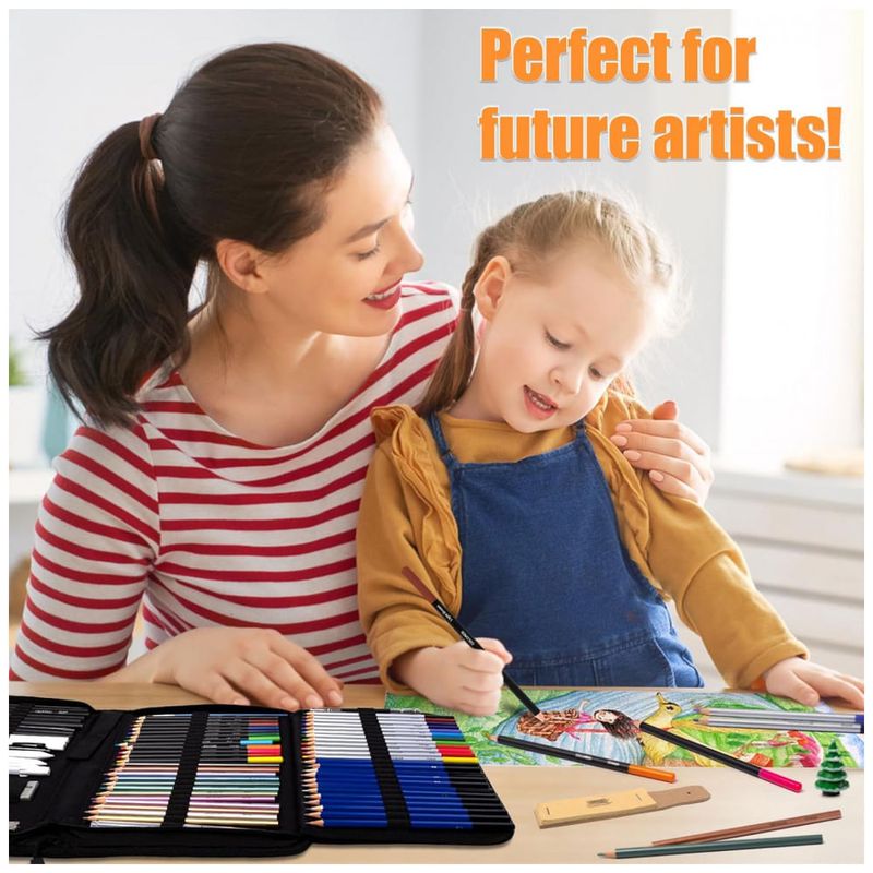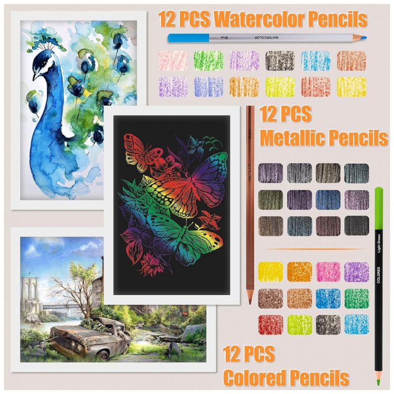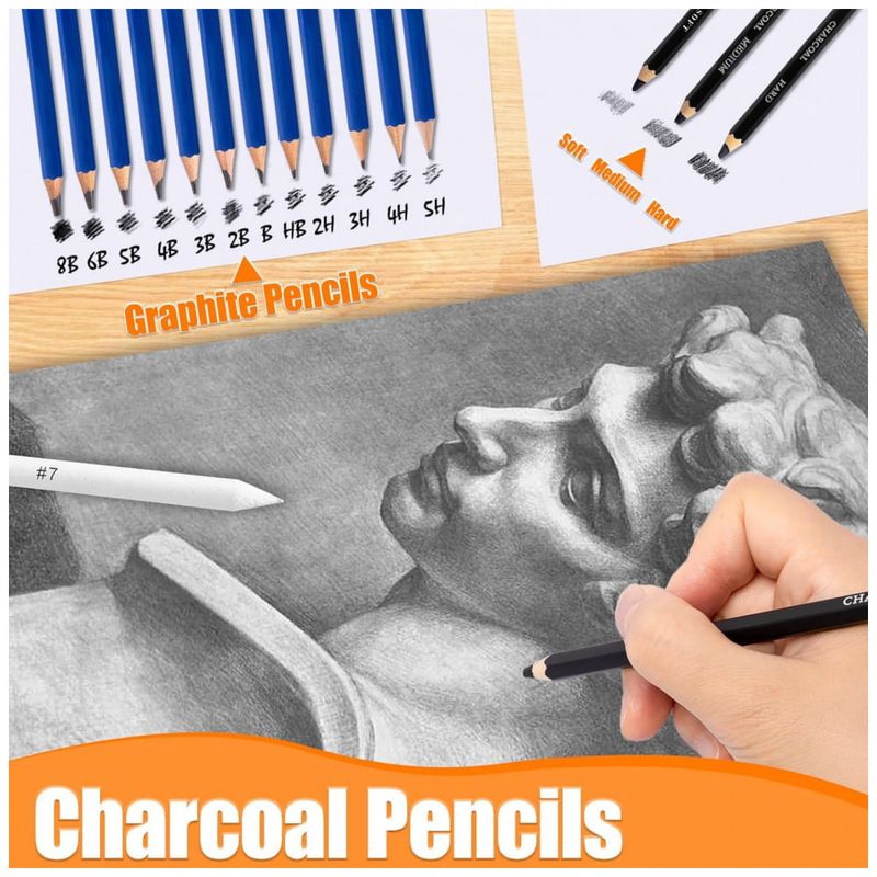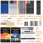 O conjunto inclui lápis de grafite em múltiplas durezas, lápis de carvão branco, preto e colorido, lápis aquareláveis, lápis de cor com base em óleo e lápis metálicos, além de um lápis de grafite maciço 6B. Esses grupos de lápis permitem transitar de traços finos e precisos a manchas amplas, misturas graduais, camadas sobrepostas e realces metálicos.