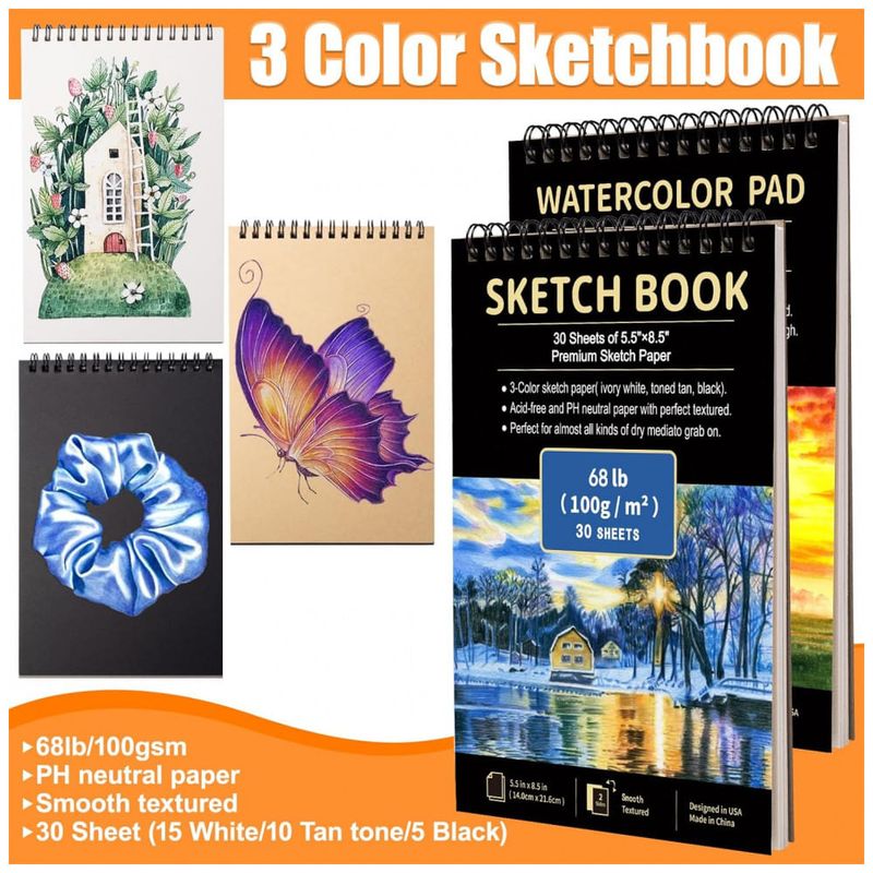 Sketchbook 3 cores: Bloco de desenho 5,5" x 8,5" com papéis em branco marfim, marrom claro e preto