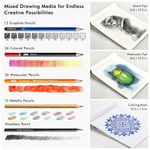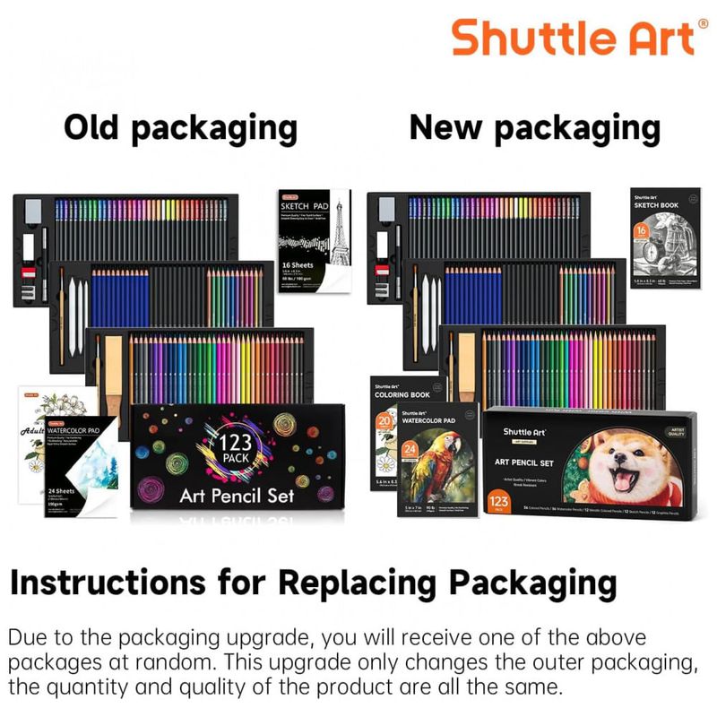 Conjunto Shuttle Art com 123 peças focado em desenho, coloração e sketch, reunindo 108 lápis artísticos e diversos acessórios em um único kit. Atende de adolescentes iniciantes a artistas adultos, indicado para estudos de desenho, colorização e técnicas mistas em papel.