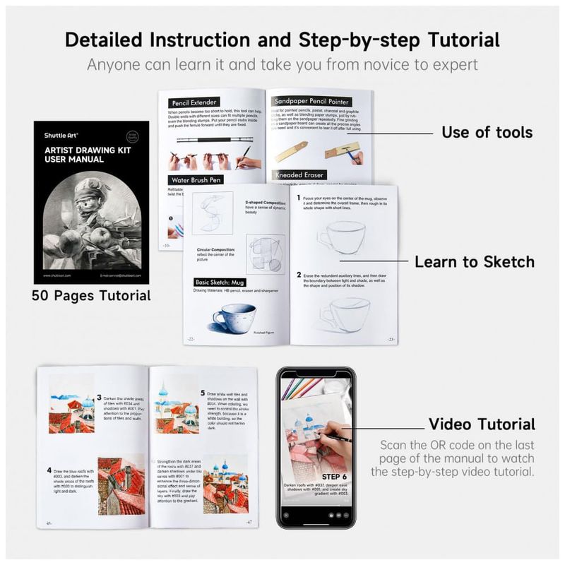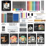 O kit também acompanha ferramentas auxiliares de desenho, como borrachas, apontador e demais acessórios para mistura, correção e manipulação dos traços. Os blocos de papel incluídos permitem iniciar a prática de desenho imediatamente, sem necessidade de aquisição separada de folhas e cadernos.