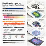 O conjunto inclui lápis de cor, lápis aquareláveis, lápis metálicos, lápis de grafite, lápis de carvão, lápis pastel e um lápis de grafite maciço, além de bastões de carvão, bastões de grafite e bastões pastel coloridos. Esses grupos de materiais possibilitam desde traços finos e detalhados até preenchimentos amplos, gradações de tonalidade e efeitos de textura em técnicas secas e parcialmente solúveis em água.