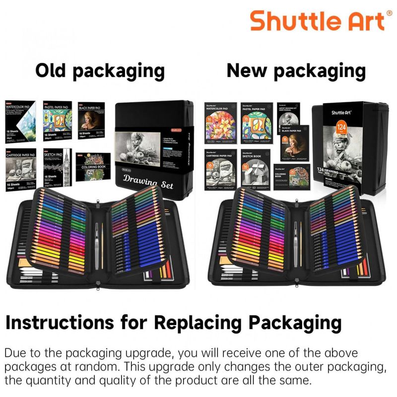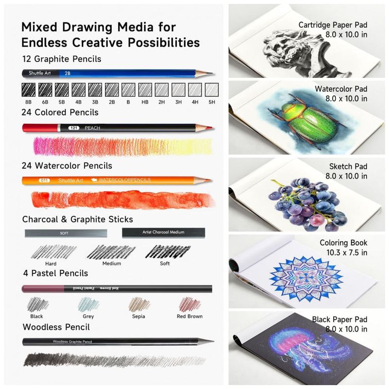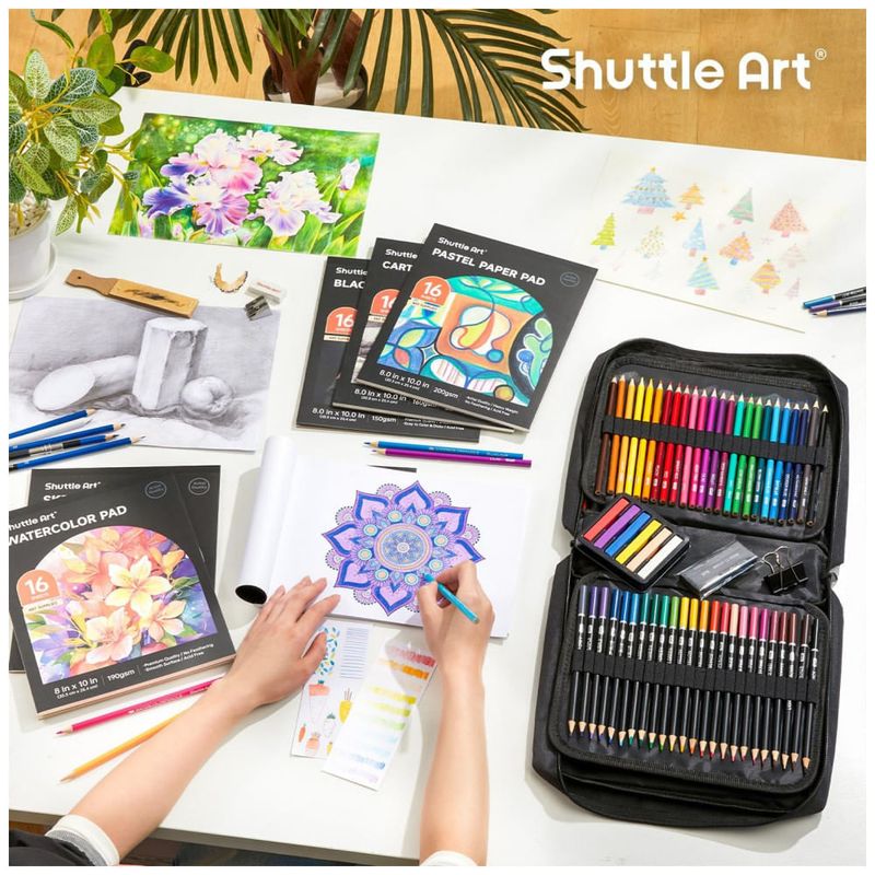 Kit de desenho Shuttle Art com 124 peças, desenvolvido para crianças, adolescentes e adultos, reunindo lápis de diferentes tipos, bastões, acessórios de desenho e blocos de papel em um estojo único com zíper. A composição permite trabalhar desenho, esboço, sombreamento, coloração, sobreposição de camadas e estudos de luz e sombra em diversas superfícies de papel.