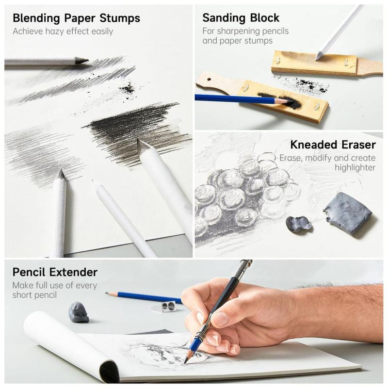 Ferramentas de desenho e mistura: Acessórios para esfumado, correção e manuseio dos traços
