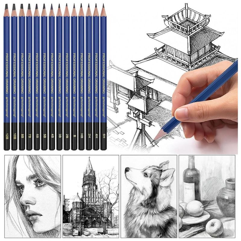 Este conjunto de lápis grafite Daerthotk com 14 peças oferece a faixa principal de durezas de 12B a 6H, adequada para desenho artístico, esboços de observação, retratos e estudos técnicos. As graduações abrangem grafites muito macios e escuros até grafites duros e claros, permitindo construir volumes por meio de variações de tom.