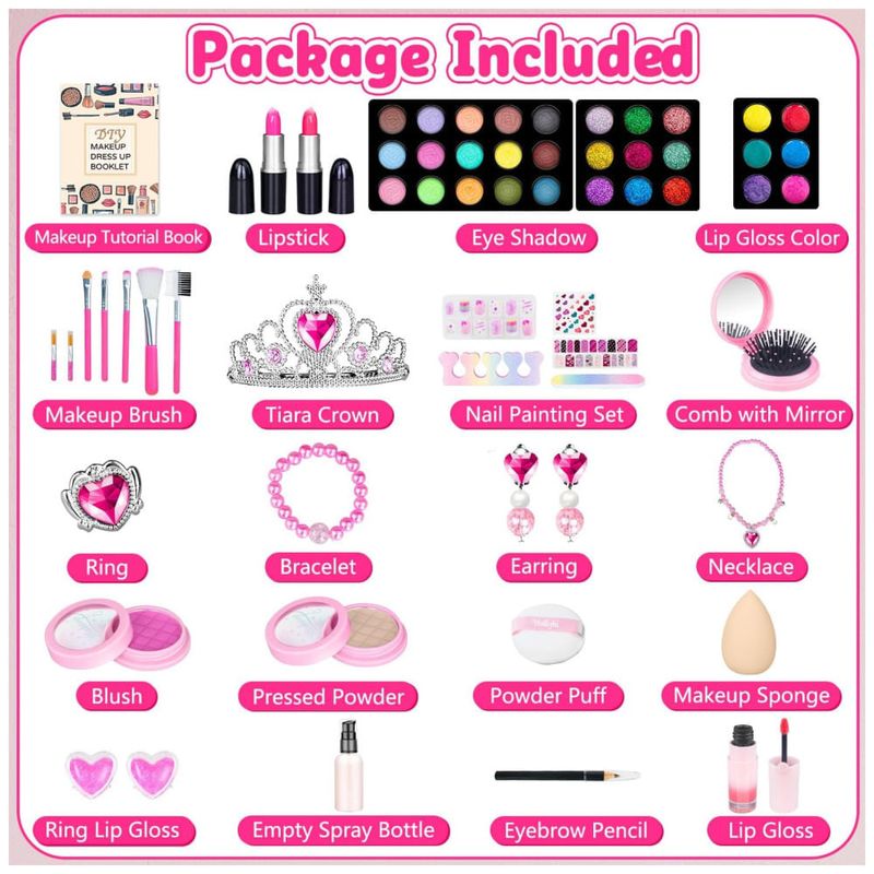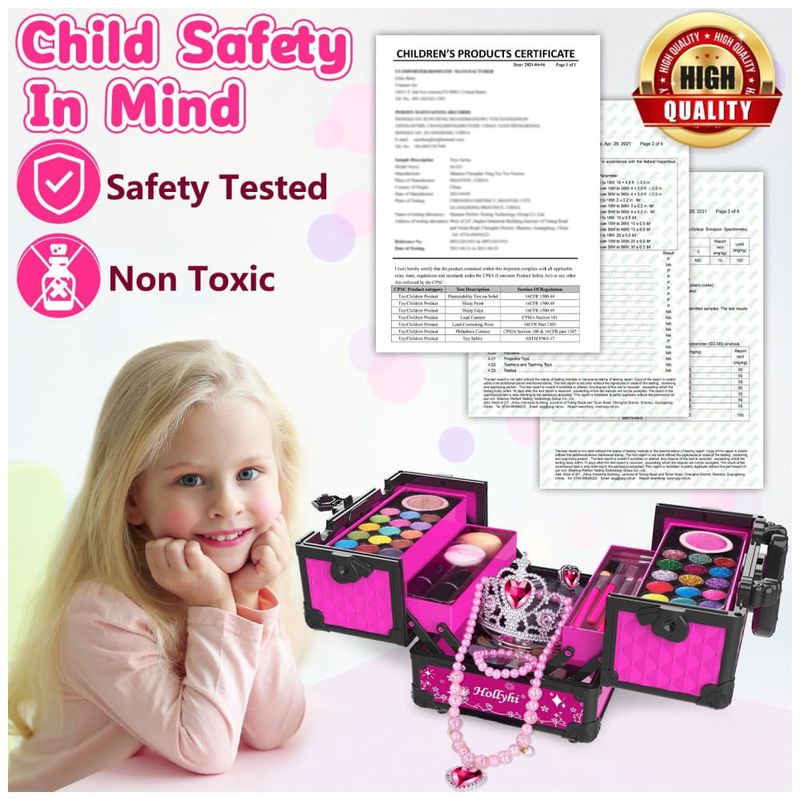 Brinquedos de maquiagem de segurança de material: O kit de maquiagem infantil é feito de material de alta qualidade, durável e renovável que atende aos padrões de brinquedos infantis internacionais (certificados CPSIA, CPC, ASTM) para segurança e foi testado no corpo, pode haver uma fragrância leve e inofensiva quando a caixa de maquiagem acaba de ser aberta, mas pode ser usada com confiança. Fácil de lavar com água e sabão, não deixa manchas na pele, roupas ou móveis. Amigável para as crianças se maquiarem.