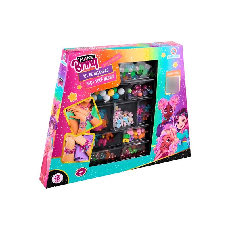 Conteúdo: 01 Kit de Miçangas Make Brinq, com miçangas em diferentes cores e formatos.