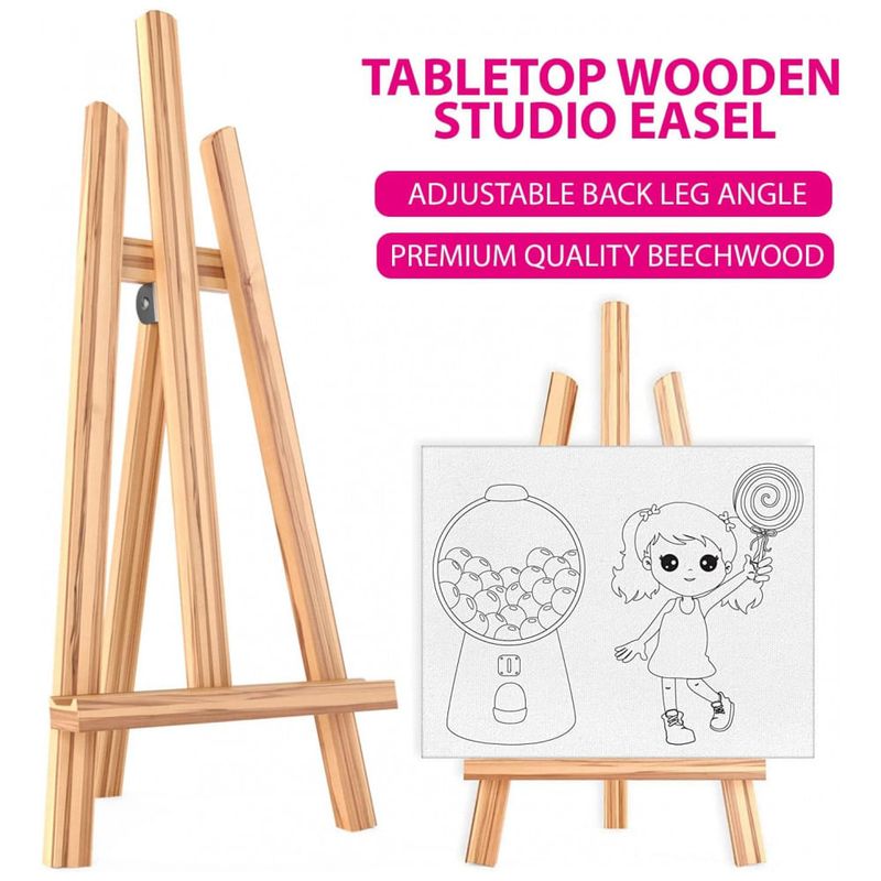 O kit inclui 12 tubos de tinta acrílica de 12 ml em cores variadas, 10 pincéis de diferentes formatos, 4 telas em algodão com desenhos predefinidos e 2 telas em branco no formato 20,3 cm x 25,4 cm. Um cavalete de madeira ajustável permite posicionar as telas em ângulo adequado para pintura e exposição.