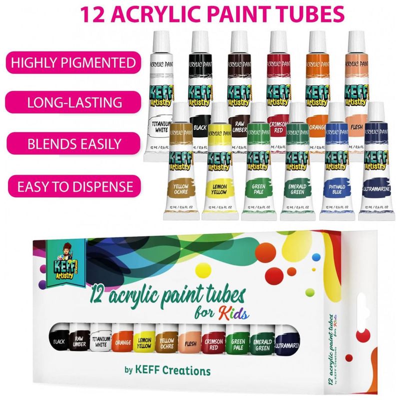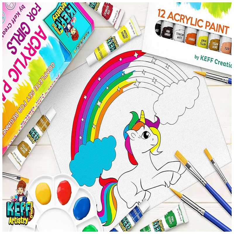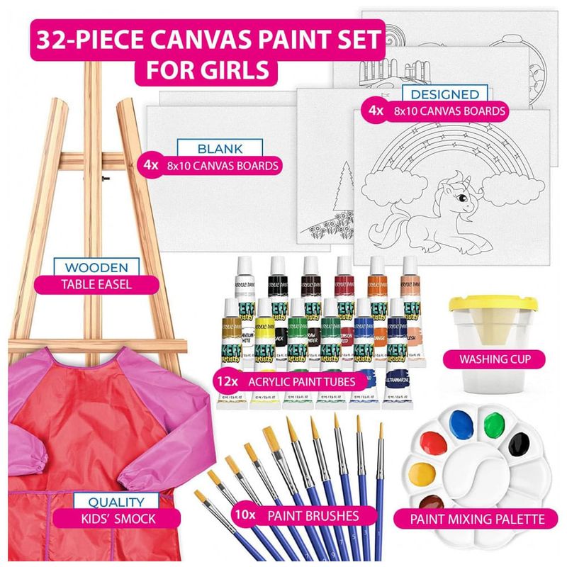 Este kit de pintura acrílica infantil KEFF com 32 peças reúne tintas, telas, pincéis e acessórios básicos para atividades de arte em casa ou na escola. O conjunto foi desenvolvido para crianças, jovens e adultos que desejam iniciar ou praticar pintura em tela com acrílica.