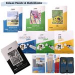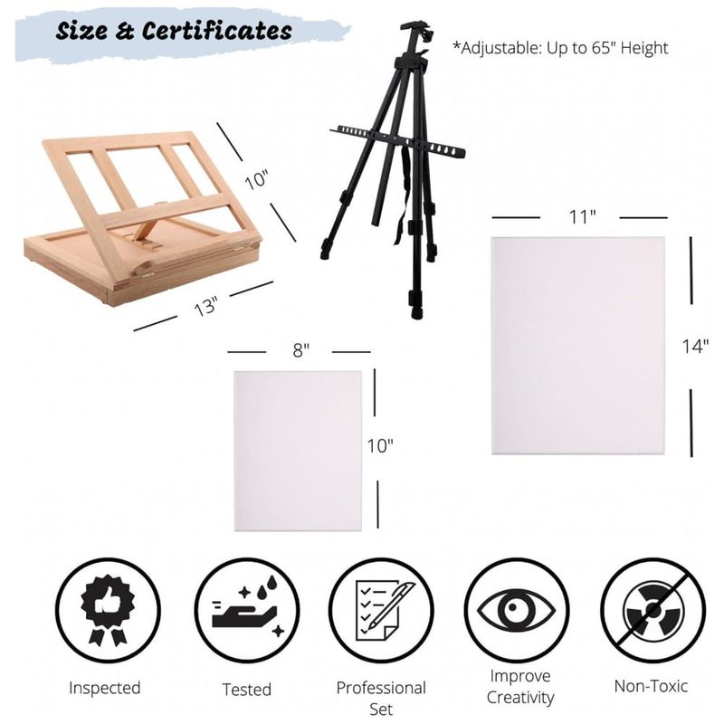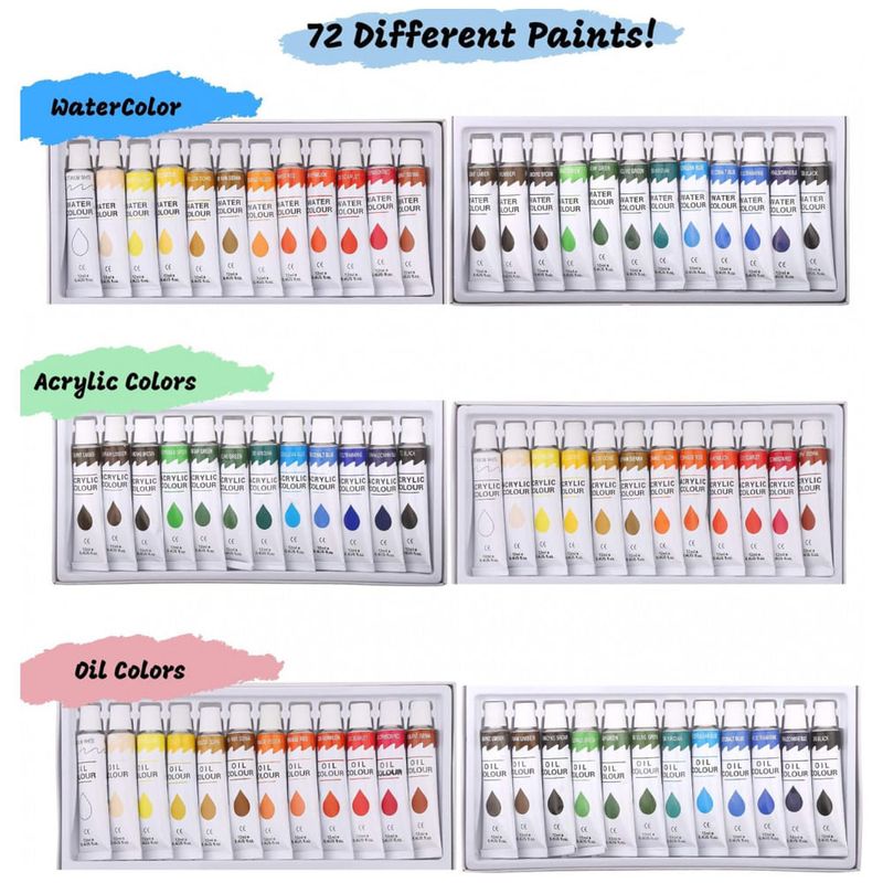 Tintas Premium Não Tóxicas em Conformidade com ASTM D4236 Óleo, Aquarela e Acrílica. Nosso cavalete de pintura profissional para adultos, também é um ótimo conjunto de pintura para iniciantes para adultos. Nosso kit de pintura a óleo, kit de tinta aquarela, conjunto de tinta acrílica com tela, inclui 12 mL ou 0,4 fl oz. 24 tintas acrílicas, 24 conjuntos de tintas a óleo, 24 tintas aquarela. Para usar com as folhas fornecidas. Tornando o um ótimo kit inicial de pintura para adultos. Suprimentos de arte para adultos Use este conjunto de pintura em tela para liberar sua criatividade.