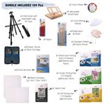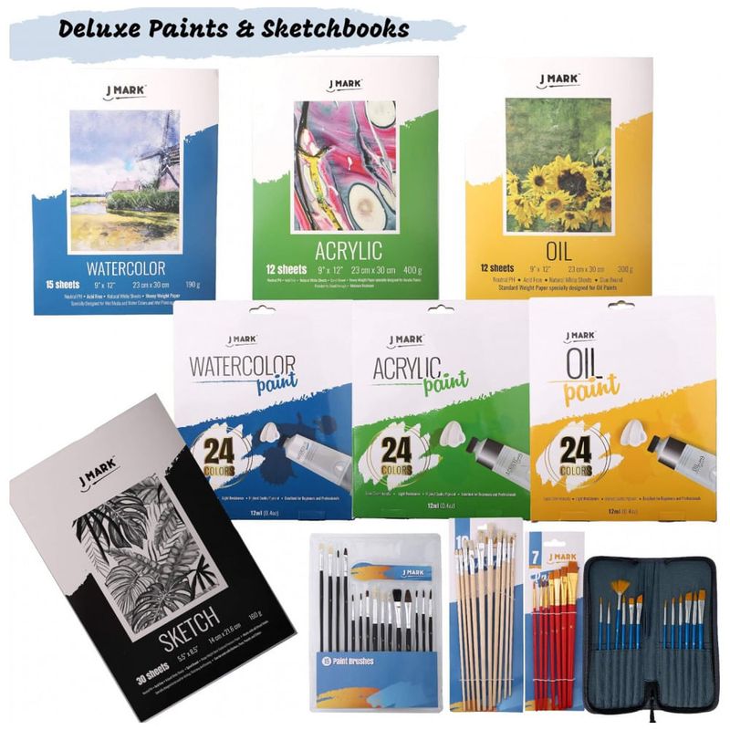 Conjunto de pintura de arte com tudo incluído de 139 peças Os kits de pintura J Mark têm tudo o que você precisa para criar obras primas incríveis, incluindo 2 cavaletes de arte para adultos, um cavalete de mesa de madeira com gaveta 10 x 13 polegadas e o segundo cavalete de campo de alumínio até 65 de altura, 8 telas em branco e conjunto de tintas para adultos 6 pacote de 8 x 10 polegadas e 2 pacotes de 11 x 14 polegadas, conjunto de pintura a óleo, conjunto de pintura acrílica, conjunto de pintura em aquarela, 2 paletas de mistura de cores com dez poços e uma roda de mistura de cores e pincéis.