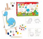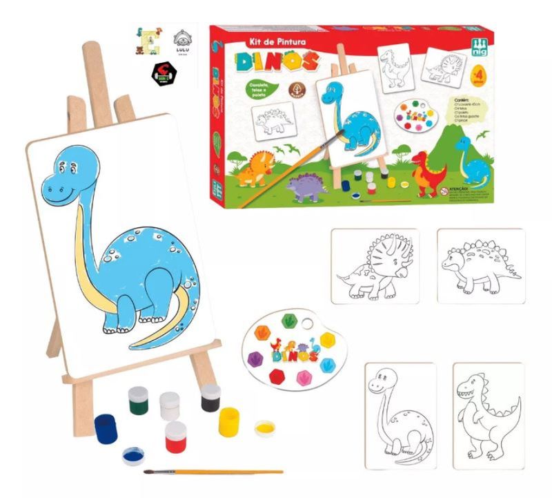 Kit de pintura com temática dinossauros com cavalete, telas e paleta para pintura. Já pensou em criar algumas cores misturando as tintas? Com essa turminha animada todos fazem a festa. Contem 01 Cavalete de 45 centímetros, 04 Telas, 01 Paleta, 06 Tintas guache e 01 Pincel. Características: - Conteúdo da Embalagem: Não informado- Marca: NIG- Modelo: 440- Dimensões da Embalagem: 48cm, 30cm, 5cm- Código de Barras: 7896200704403- Certificação: INMETRO Recomendado para maiores de 4 anos. Importante: - Nossos produtos encontram-se em estoque- Todos os produtos são lacrados- Produtos acompanham nota-fiscal e garantia