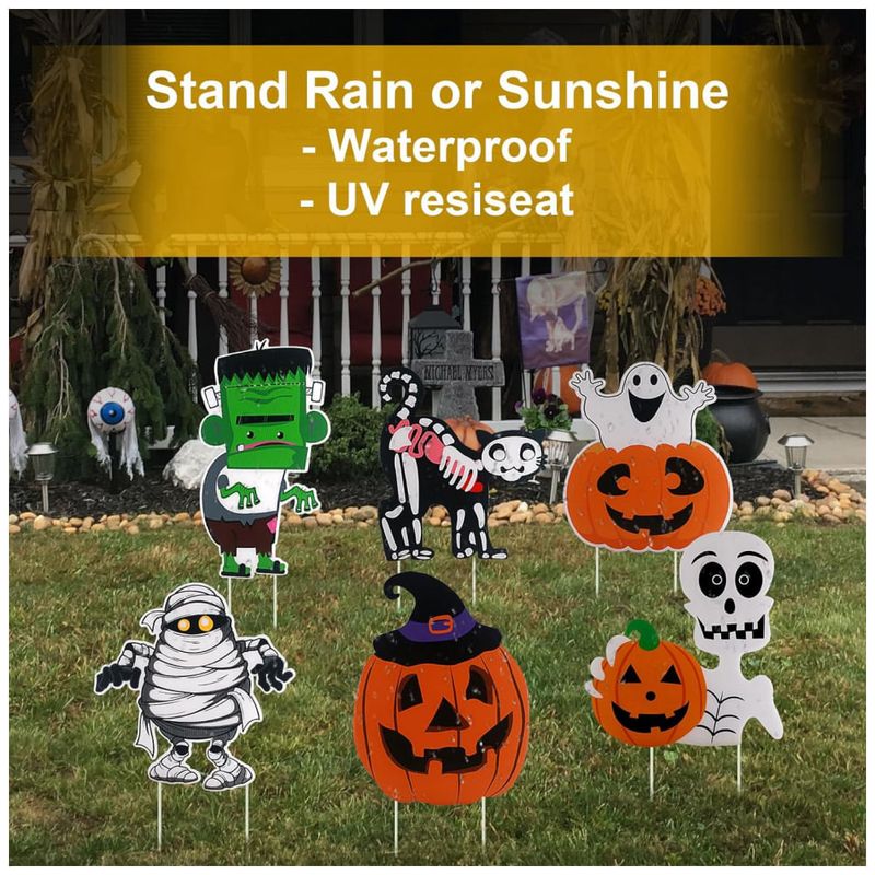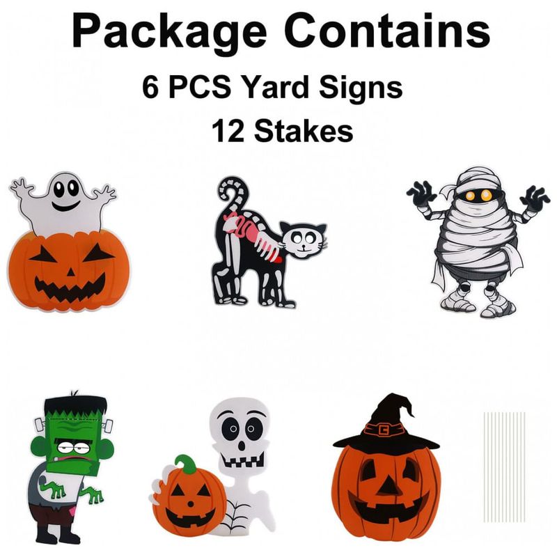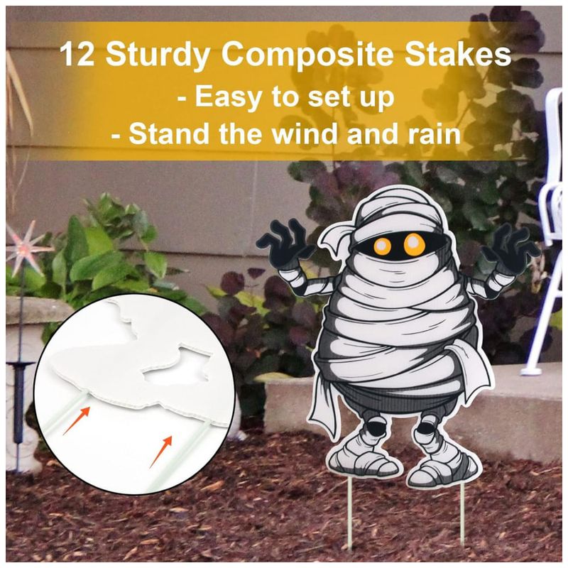 UM MEGA CONJUNTO: Decorações de Halloween incluindo fantasma, abóbora, esqueleto feliz, gato preto, monstro, múmia, etc. 6 placas de jardim 12 estacas de plástico