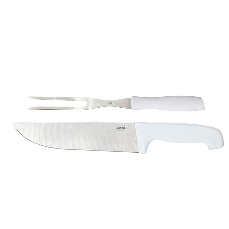 Não basta ter uma boa carne, também é preciso ter uma boa faca. O Kit do Assador da Mor vem com uma faca e um garfo produzidos em aço inoxidável, que confere durabilidade e resistência à lâmina, e cabos brancos em polipropileno que facilitam a higiene e dão firmeza durante o manuseio. Itens que não podem faltar em qualquer churrasco de domingo e são uma ótima opção de presente em qualquer ocasião!