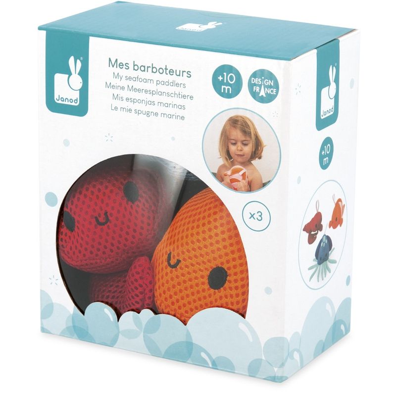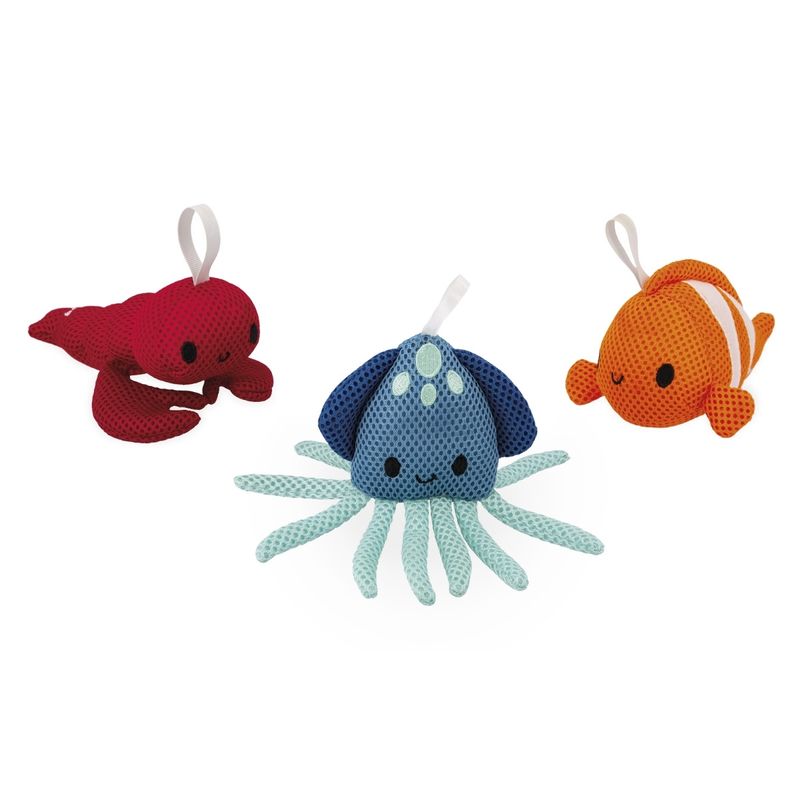 Qualquer que seja a escolha, uma coisa é certa... todos os 3 vão fazer o trabalho! Basta molhar a esponja, ensaboá-la e deixar a limpeza por conta dos pequenos, já que esses produtos foram projetados especificamente para suas mãos pequenas. Nossos pequenos animais marinhos têm um laço acima de suas cabeças para facilitar a secagem. Este brinquedo de banho é adequado para crianças a partir de 10 meses de idade.