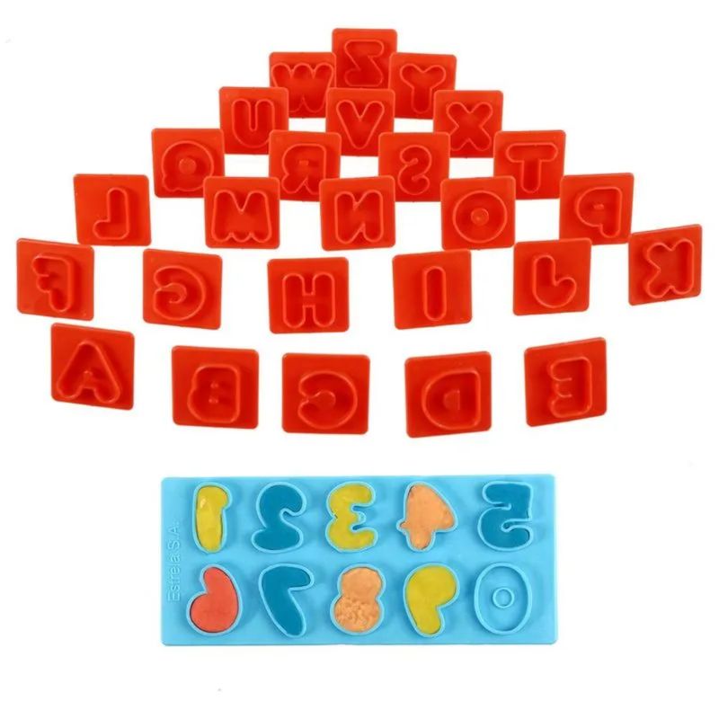 3 formas dupla face com 2 formatos geométricos cada 1 rolinho 1 faquinha 4 potes de Massa Estrela (50g cada) Brincadeira + Aprendizado: