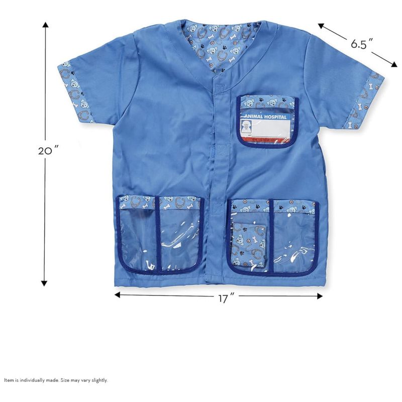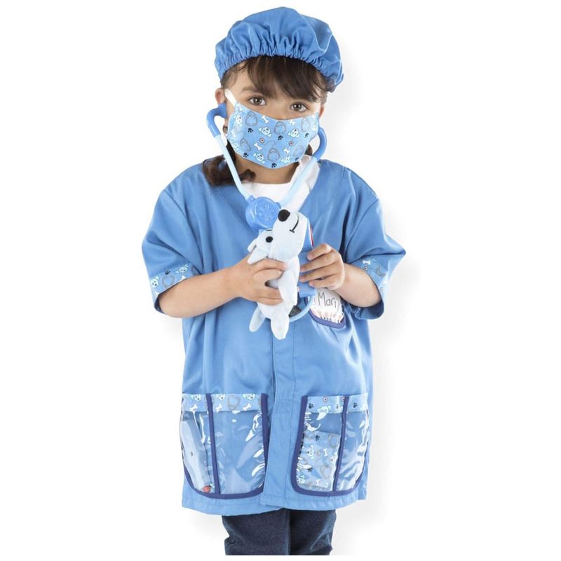 Seu filho ou filha pode se tornar um veterinário de brinquedo com este conjunto de fantasias da Melissa Doug. O conjunto inclui uma jaqueta azul lavável, máscara e touca cirúrgica, estetoscópio com efeitos sonoros, seringa, termômetro, curativo, crachá veterinário reutilizável, cachorro de pelúcia paciente e muito amor para dar. A fantasia é feita com materiais de alta qualidade e montada com padrões de fabricação precisos para garantir durabilidade.