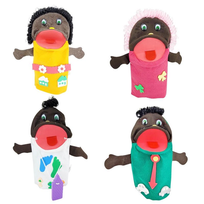 Conteúdo da Embalagem: kit de 7 Fantoches Velcro Família Negra Com 1 Vovô, 1 Vovó, 1 Bebê, 1 Papai, 1 Mamãe, 1 Menino E 1 Menina.