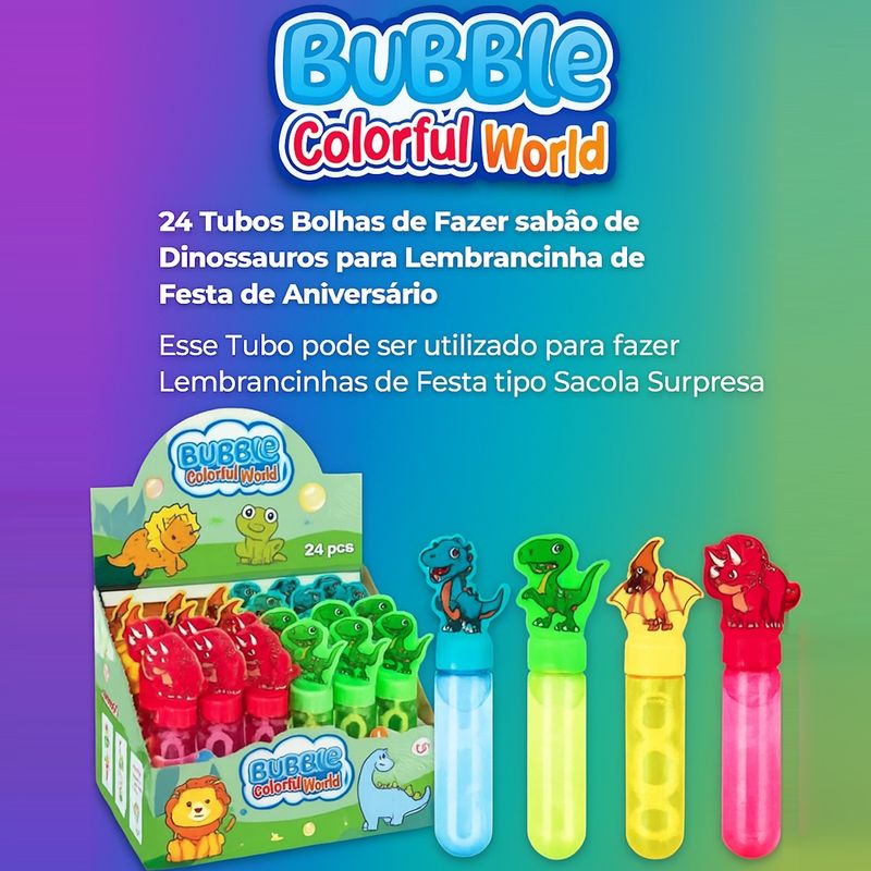 Fazer bolinhas de sabão é super divertido, as crianças soltam a imaginação e interagem entre si. Os 4 tubos de bolhas de sabão são de plástico flexível, não quebra, por isso não tem perigo de machucar. São 4 cores de tubos de dinossauros diferentes: azul, amarelo, vermelho e verde. Cada tubo possui 3 argolas e contém 100 ml de líquido pronto para assoprar e se divertir com as bolhas.