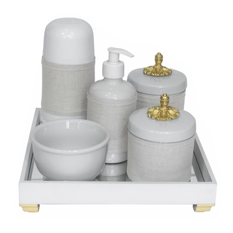 Kit higiene com bandeja de MDF em pintura branca com detalhe dourado, fundo de espelho e decoração com resinas tema Provençal dourada nas tampas dos potes com capas.