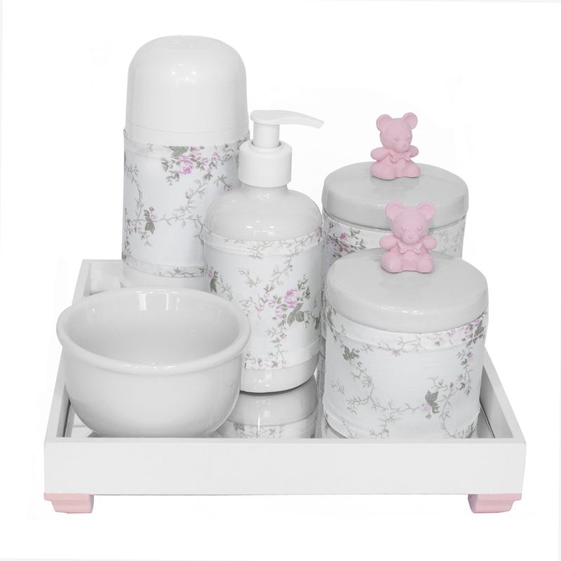 Kit higiene com bandeja de MDF em pintura branca com detalhe rosa, fundo de espelho e decoração com resinas de Ursinho rosa nas tampas dos potes com capas.