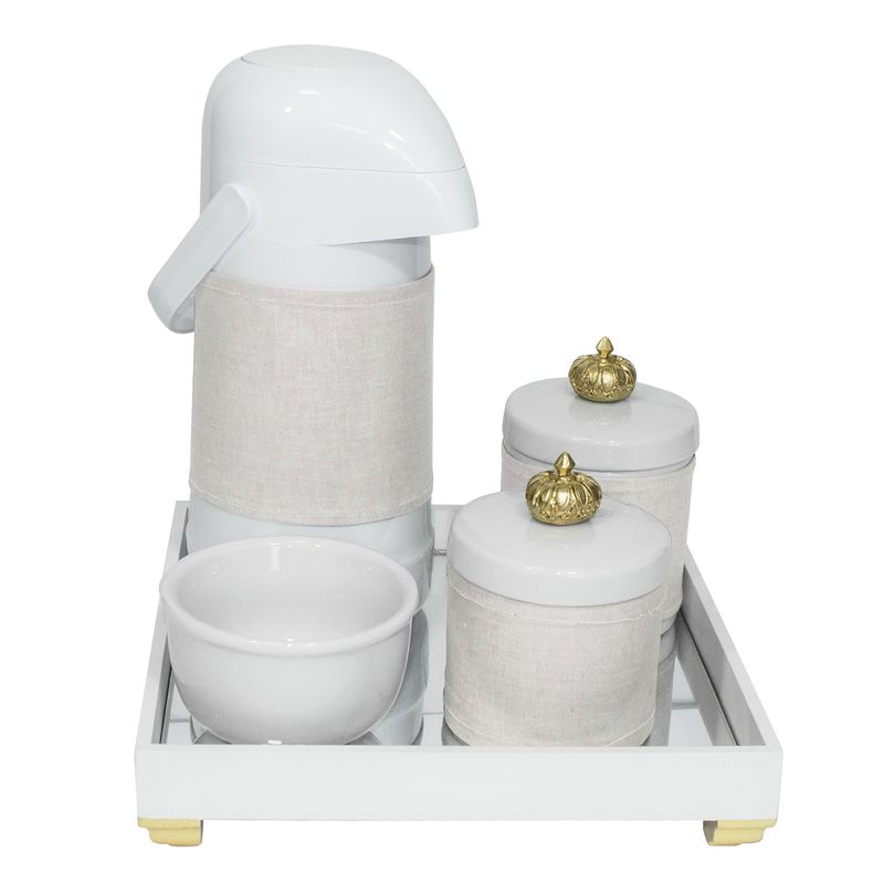Kit higiene com bandeja de MDF em pintura branca com detalhe dourado, fundo de espelho e decoração com resinas de Coroa dourada nas tampas dos potes com capas.