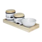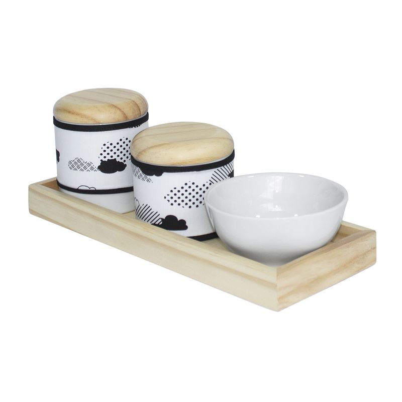 Kit higiene com bandeja e tampas dos potes em madeira pinus encerada.