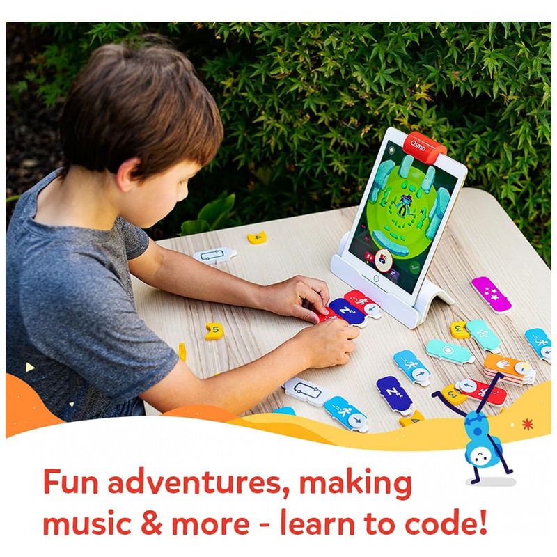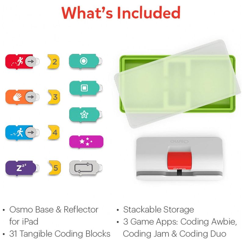 O QUE ESTÁ NA CAIXA: Base e Refletor Osmo para iPad, 31 blocos de codificação tangíveis, incluindo: Caminhada, Salto, Mão, Magia, Descanso, Quantificadores Números, Repetição, Sub rotinas, zenamento empilhável para peças de jogo, 3 aplicativos de jogo: Coding Awbie, Coding Jam e Coding Duo.