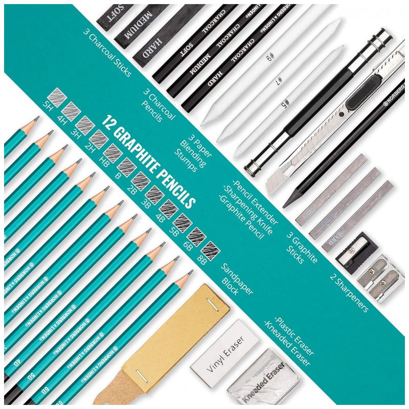KIT DE DESENHO COMPLETO conjunto de 12 lápis de grafite premium 8B,6B,5B,4B,3B,2B,B,HB,2H,3H,4H,5H, bloco de desenho de 100 folhas, 1 lápis especialista sem madeira de grafite ultra macio, 2 apontadores para lápis de grafite e carvão, 3 lápis de carvão em macio, médio e duro, 3 grafite e 3 bastões de carvão em macio, médio e duro, 1 borracha amassada, uma borracha de plástico, vinil, 1 bloco de lixa, 3 tocos de mistura de papel, 1 extensor de lápis e 1 faca de arte