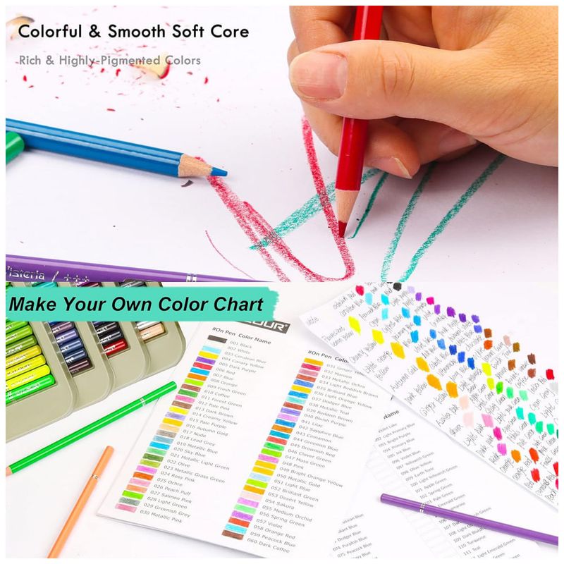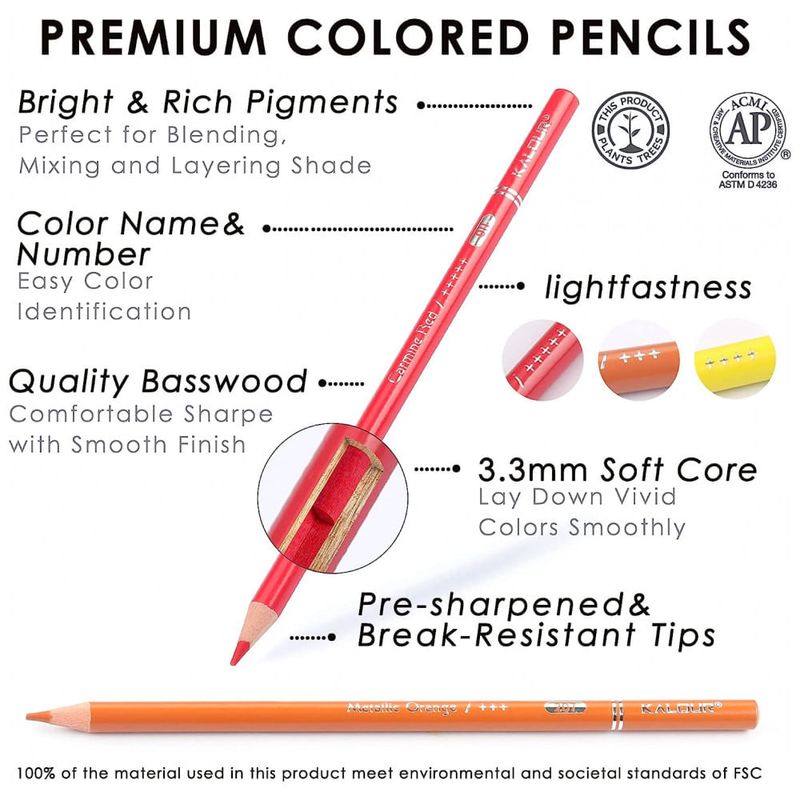 Numerado e nomeado Cada corpo de lápis tem um número único e um nome de cor para facilitar a identificação da cor. O lápis de cor é feito de basswood de alta qualidade, que é muito fácil de afiar. Em conformidade com US ASTM D 4236 e EN71 3. não tóxico.