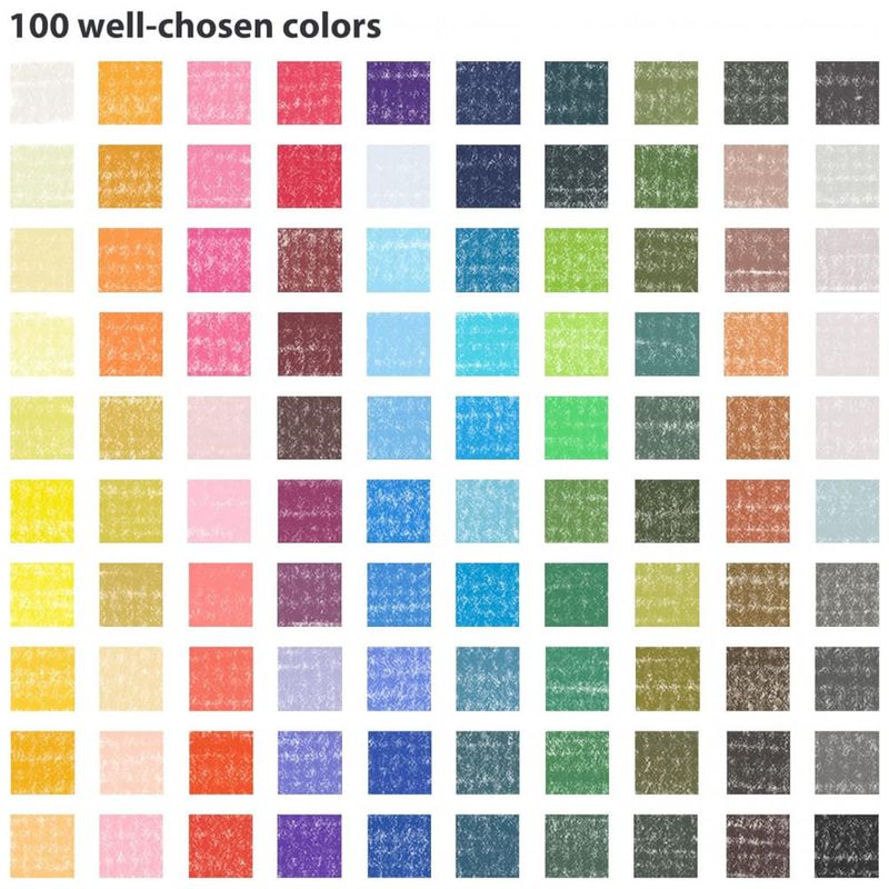 Uma ampla seleção de cores Que lindo kit de suprimentos de arte em pastel macio Do escuro ao claro, do preto ao branco, 100 cores vivas e brilhantes são bem escolhidas para satisfazer suas necessidades de giz pastel. Agora que todas as cores estão prontas, é hora de explorar sua criatividade