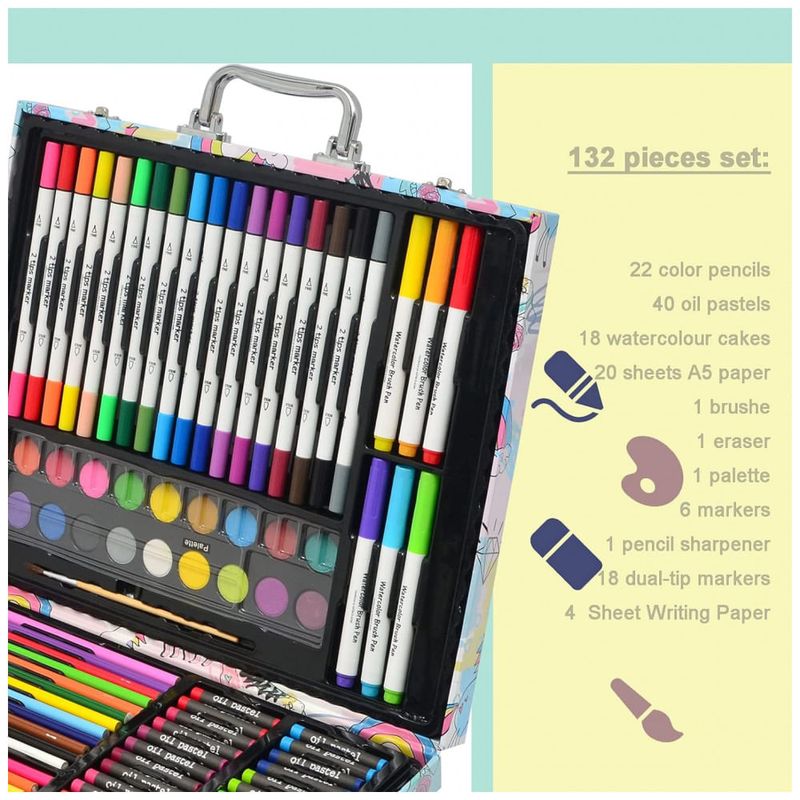 Este conjunto de arte deluxe de 132 peças inclui todas as ferramentas necessárias para um artista criar um belo conteúdo. É adequado para artistas iniciantes e veteranos, crianças e adultos. Este conjunto de arte de alta qualidade é amplamente utilizado por estudantes e artistas profissionais.