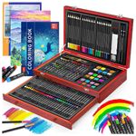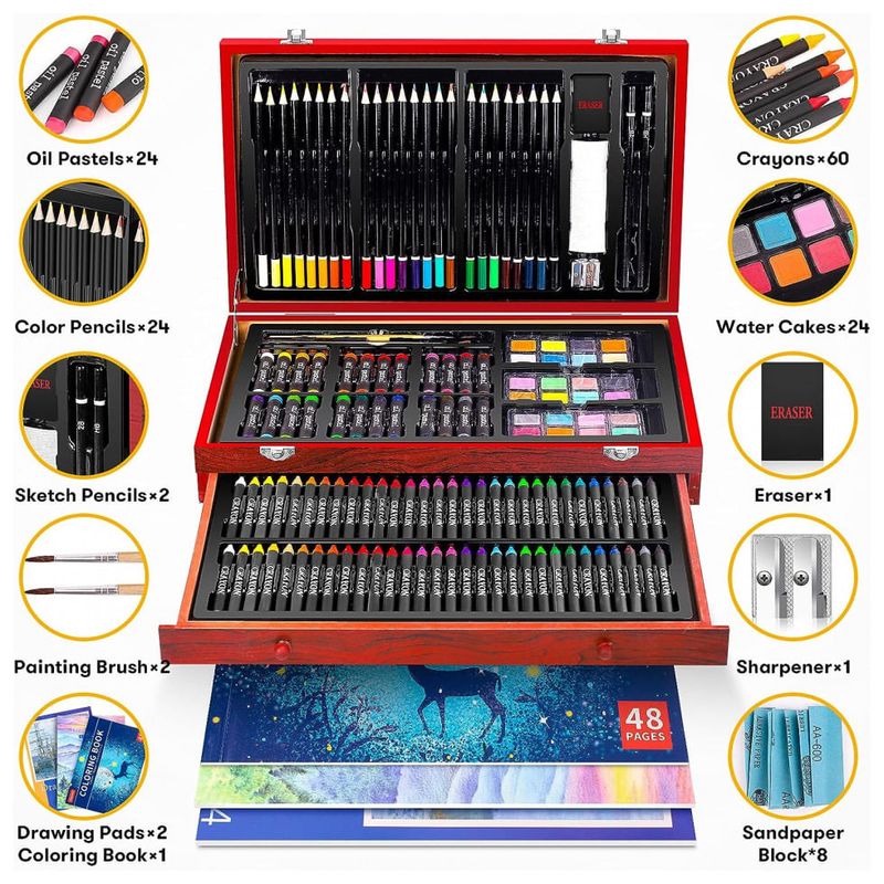 Kit de arte Deluxe de alta qualidade O estojo de arte Deluxe tem tudo o que você precisa para começar a criar em um estojo de madeira compacto Você pode começar a desenhar, colorir e pintar assim que abrir a caixa. Especialmente concebido com 2 grandes cadernos de desenho, 1 livro de colorir, 1 caixa de presente. Grande conjunto de arte para qualquer nível de artista. Este caso de arte é um ótimo presente para adultos e crianças, meninas e meninos, eles vão se divertir muito