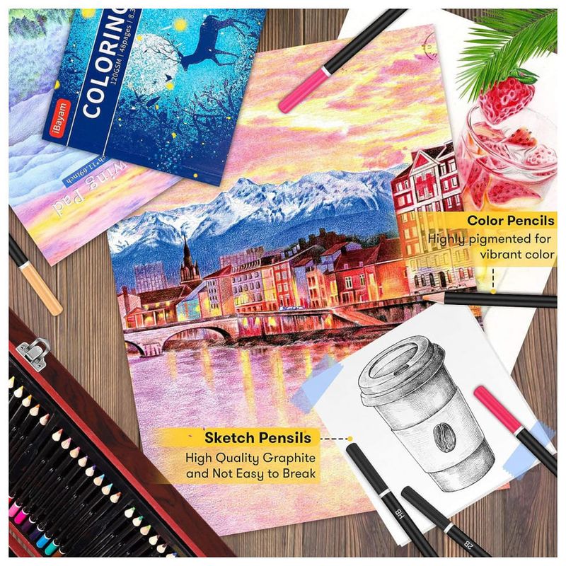 Kit Lápis de Cor Profissional com Maleta de Madeira 150 peças Tintas Acrílicas, Aquarela, IBAYAM, Azul