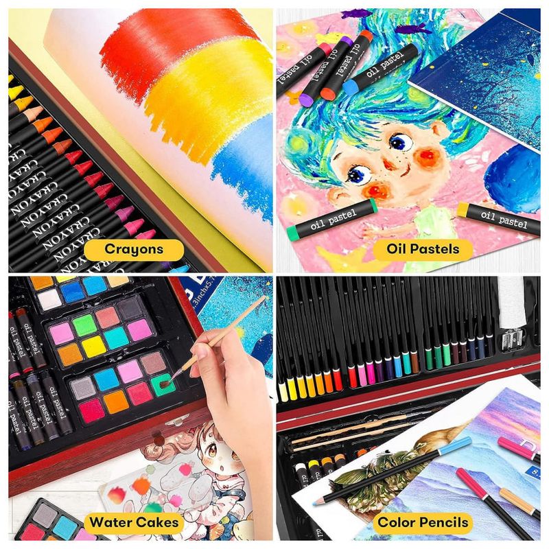 Suprimentos de arte suficientes Este conjunto de desenho Premium inclui 24 lápis de cor, 24 pastéis de óleo, 24 bolos de aquarela, paletas de 3x8 poços, 2 blocos de desenho, 1 livro de colorir, 2 lápis de desenho, 2 pincéis, 10 blocos de lixa, 1 apontador de lápis, 1 régua, 1 borracha, 60 giz de cera, 1 estojo de arte em madeira e caixa de presente. Eles são as melhores ferramentas para mostrar o incrível talento de alguém no desenho. Grandes conjuntos de arte para crianças pequenas que são iniciantes e exploram sua curiosidade