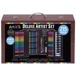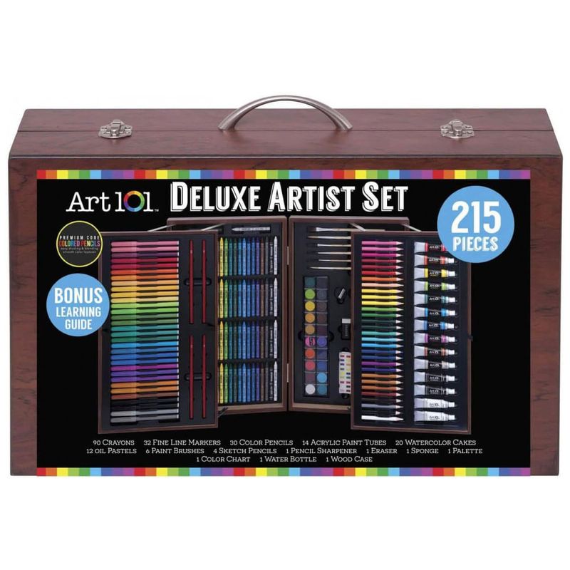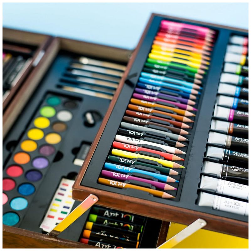 O estojo de madeira de luxo tem duas gavetas pop up com uma ampla variedade de mídias.