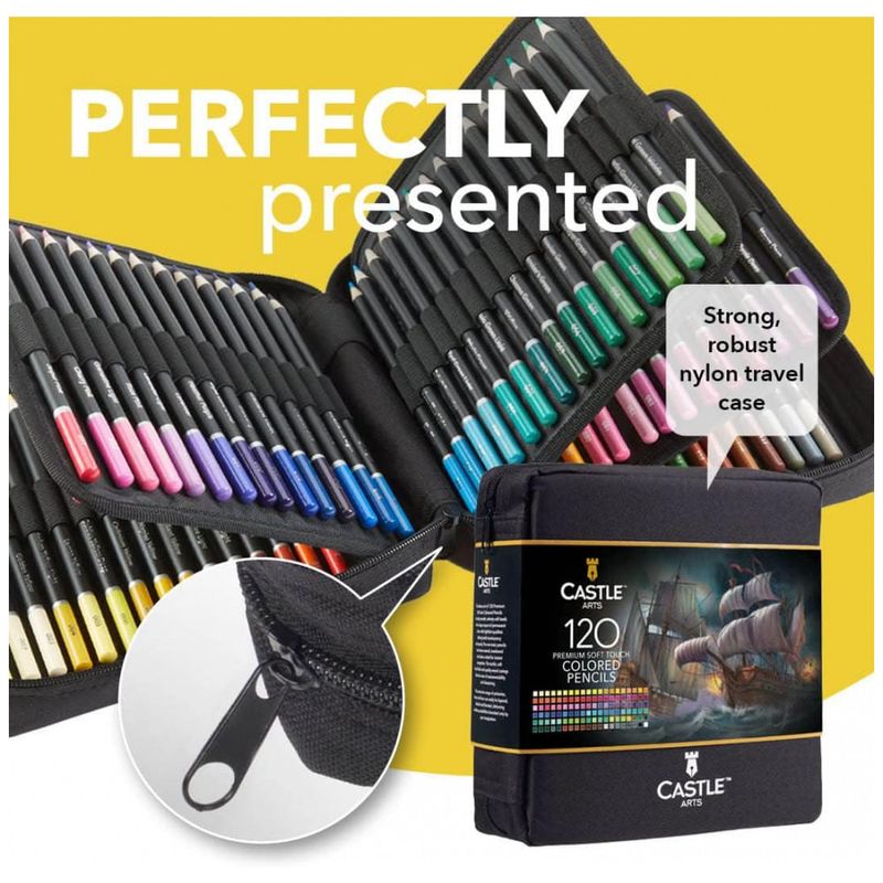 FEITO PARA FACILITAR Gama incomparável de 120 lápis organizados em famílias de cores nomeado, numerado e codificado por cores para uma seleção infalível basta alternar entre as camadas da capa protetora de tecido com zíper para levar a qualquer lugar