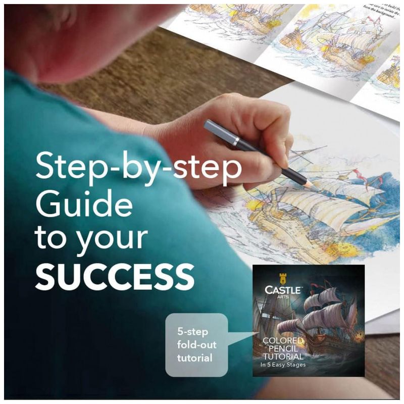 DESENVOLVA SUAS HABILIDADES O tutorial dobrável exclusivo permite que você refine suas habilidades com lápis de cor recriando a impressionante ilustração do galeão na capa da manga