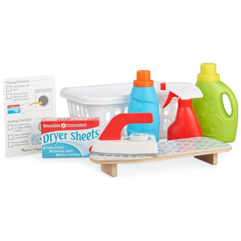 As crianças vão se divertir borrifando, medindo e pressionando com o borrifador removedor de manchas, que pode ser enchido com água, detergente e amaciante de roupas com tampas removíveis. Além disso, o conjunto conta com uma caixa com três folhas de secar falsas e um ferro e tábua de passar de madeira.