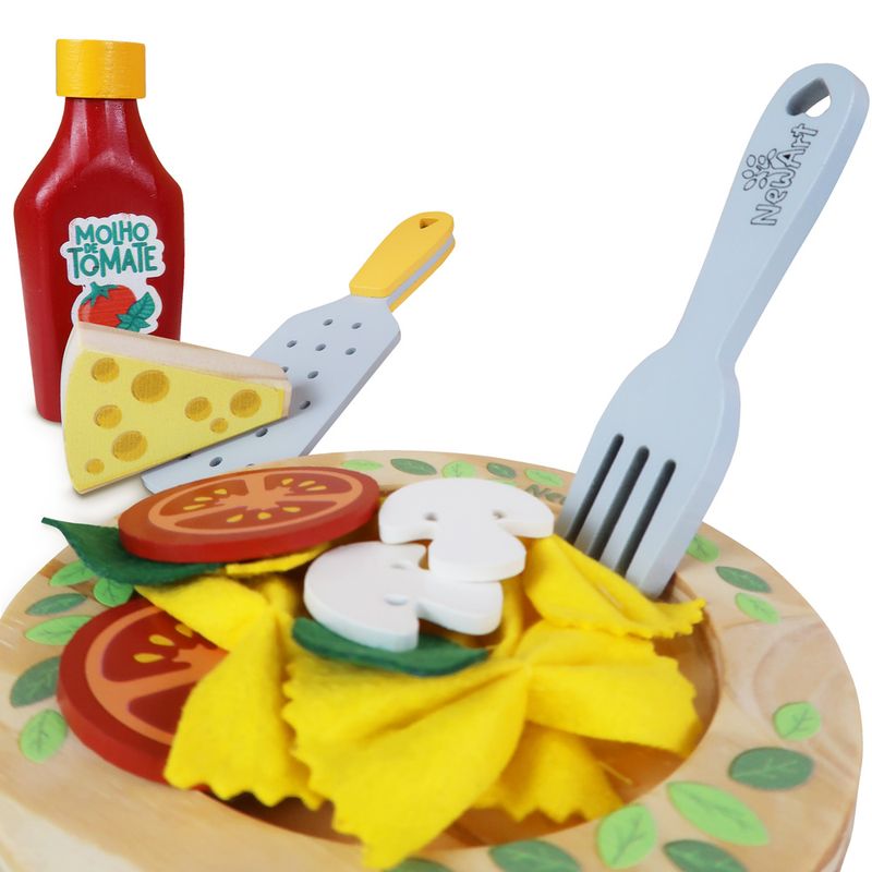 Criatividade Kit contém: 1 prato, 1 garfo, 1 faca, 1 ralador de queijo, 1 molho de tomate, 1 queijo, 2 tomates, 3 Champions, 3 folhas de manjericões em feltro, 10 macarrões espaguetes em feltro e 7 macarrões gravatinhas em feltro. Idade Recomendada: A partir de 3 anos. Material: Madeira Reflorestada e tratada