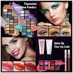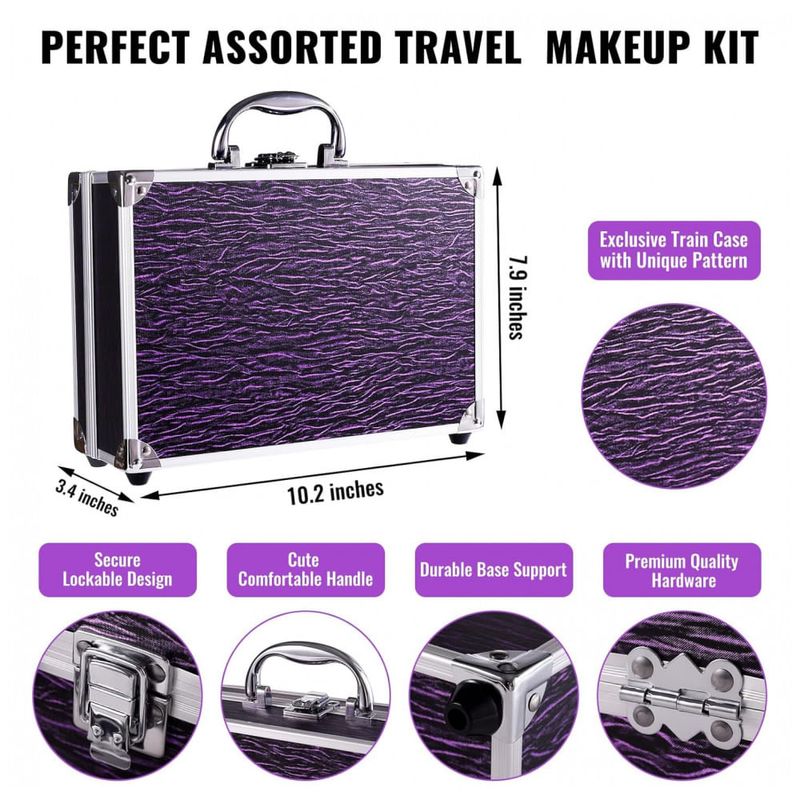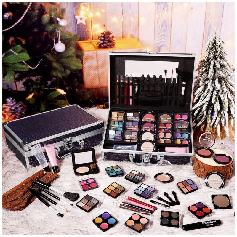 Kit maquiagem completo CHARMCODE com estojo de alumínio reutilizável, contendo 2 lápis para olhos, 2 lápis para lábios, 1 máscara, 1 pó facial compacto, 4 aplicadores puff, 4 pincéis, 6 paletas compactas de sombras, 2 blushes, 2 iluminadores, 1 contorno, 2 paletas compactas de cores labiais, 1 pó para sobrancelhas compacto, 1 sombra cremosa compacta, 1 corretivo cremoso compacto, 2 tubos de gel cremoso labial e espelho acoplado.
