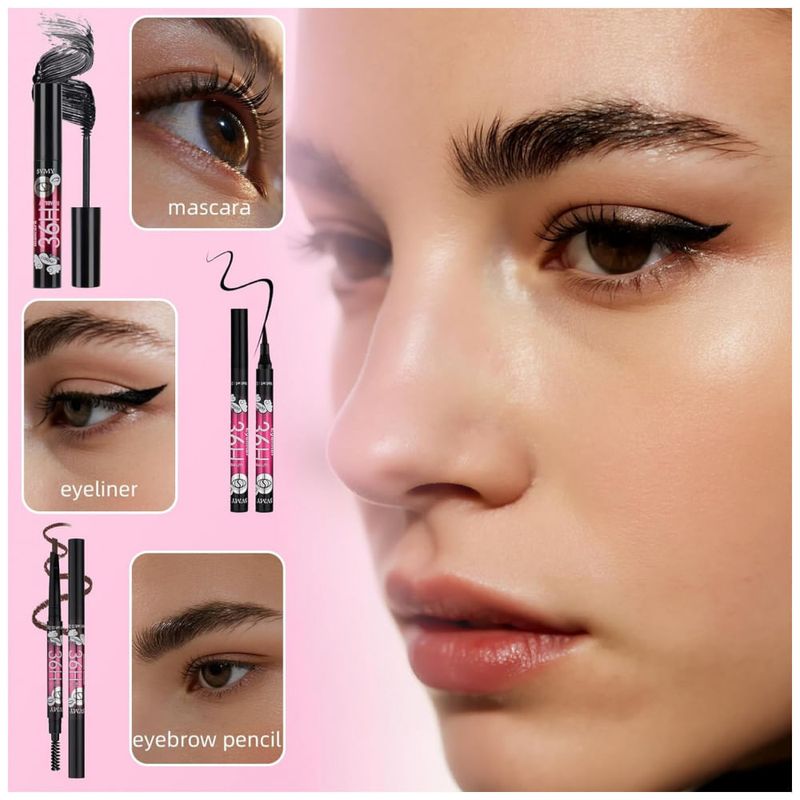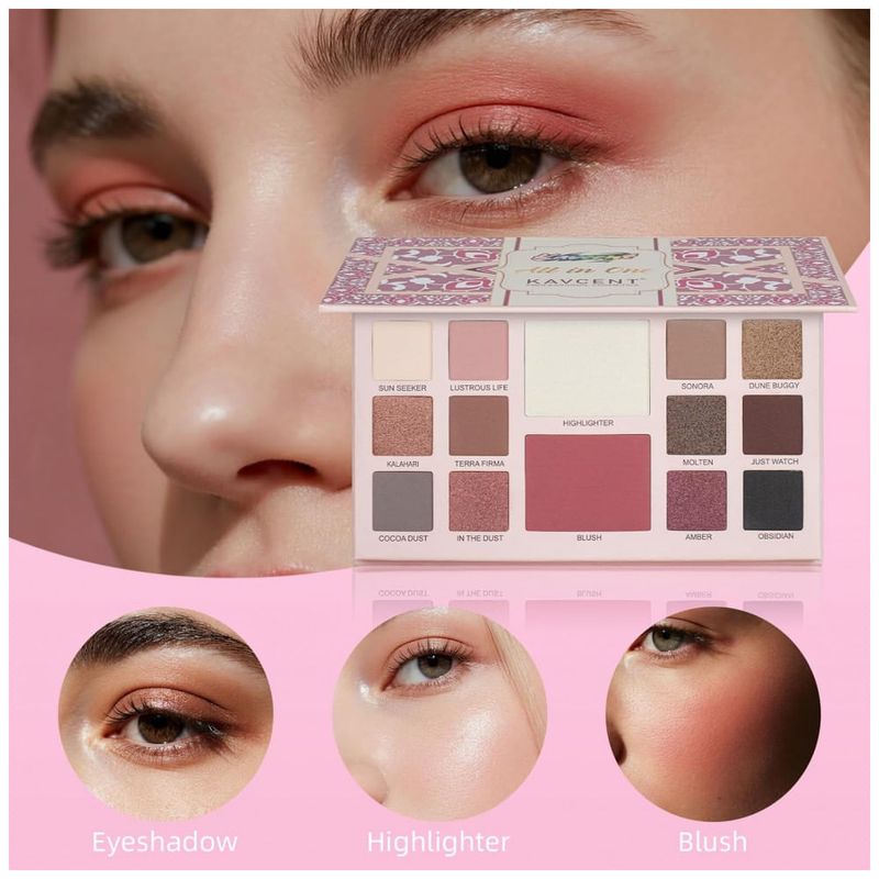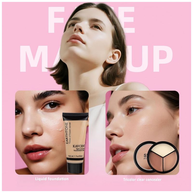 Kit maquiagem tudo em um KAVCENT com paleta multifuncional, gloss labial, paleta de batom, foundation líquida, corretivo, máscara, lápis para sobrancelhas, delineador, puff de pó e conjunto de pincéis para aplicação completa em rosto, olhos e lábios.