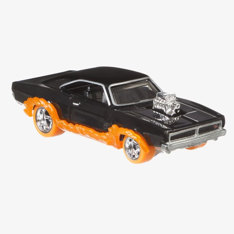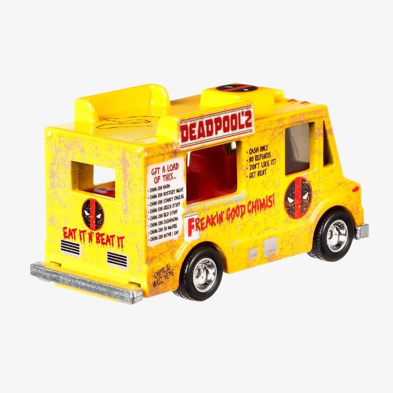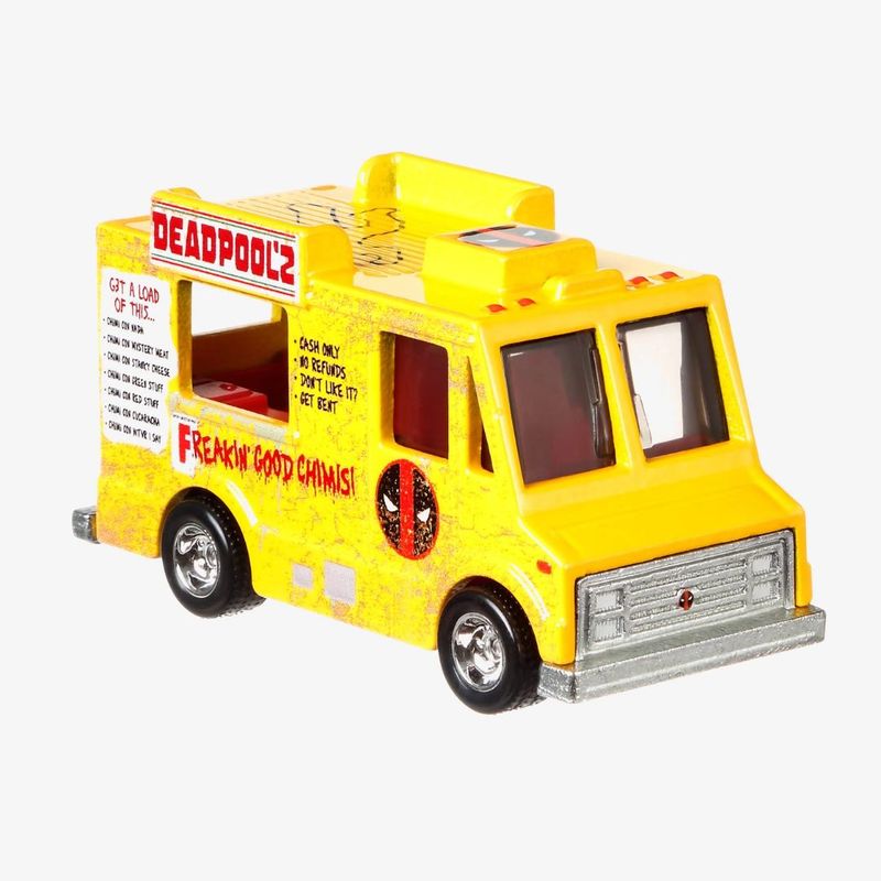 Inclui veículos reimaginados como Hot Wheels de potências cômicas a Dodge Charger Cavaleiro Fantasma, o Food Truck do Deadpool, a Máquina-Aranha e a espaçonave Milano.