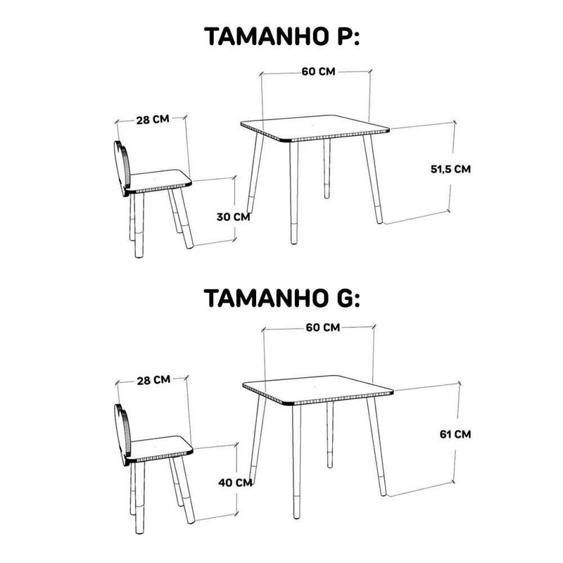 Cadeira G (a partir de 7 anos): Largura 28 cm | Altura até o assento 40 cm | Profundidade 28 cm | Suporta até 80 kg Fabricados em MDF 15mm com pés de madeira pinus, garantindo alta durabilidade. Produto desmontado, com processo de montagem simples e rápido.