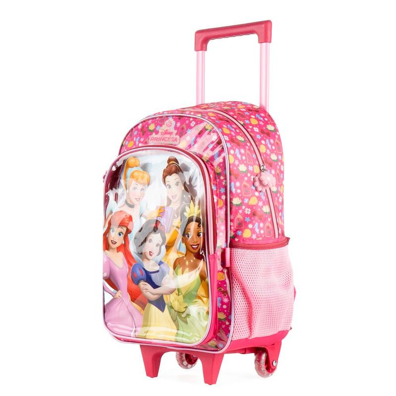 O Kit Princesas Disney traz praticidade e charme para a rotina escolar com mochila de rodinhas e lancheira térmica. A mochila oferece ótimo espaço interno, bolso frontal, bolsos laterais para garrafinha, alça retrátil e rodinhas resistentes, além de detalhes encantadores como puxador em formato de coração e estampa vibrante das princesas.A lancheira térmica mantém os alimentos frescos e pode ser acoplada à mochila, facilitando o transporte. Um conjunto leve, resistente e perfeito para quem ama as Princesas Disney.