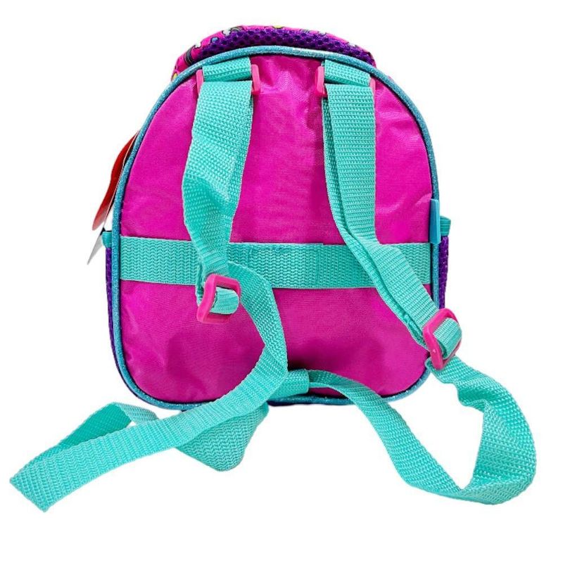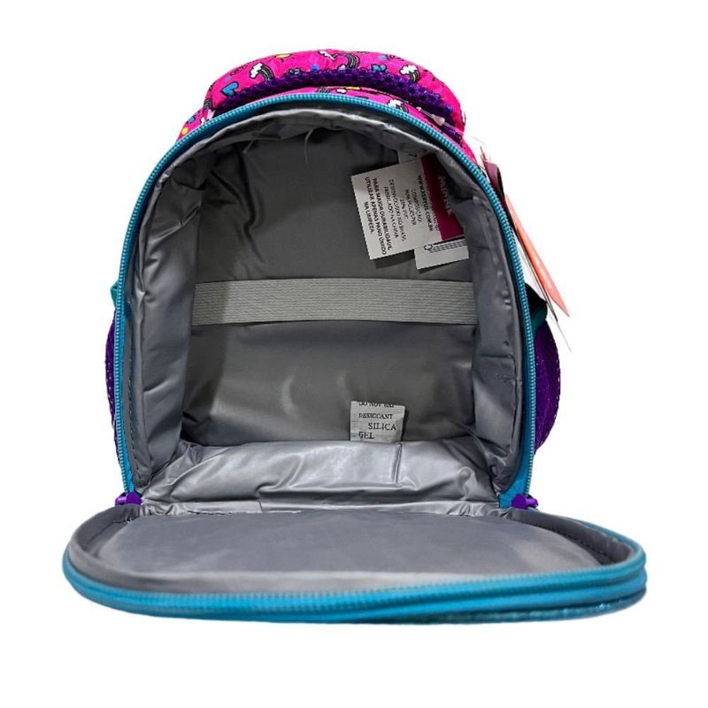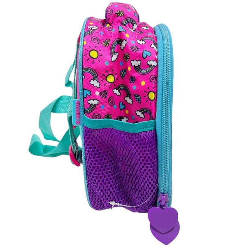 Em tamanho 16", produzida em poliéster resistente e estampado. Painel frontal PVC vincado com espuma com detalhes com glitter - Compartimento principal amplo mais um compartimento frontal , 2 bolsos laterais mesh, zíper com puxadores personalizados, alça de mão em nylon com mesh e piping com glitter . Carrinho em metal com travas.