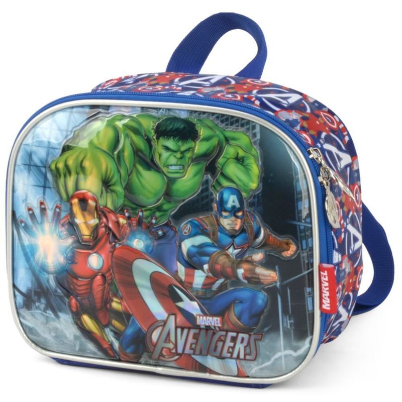 A Lancheira do kit é uma adição prática, oferecendo um espaço isolado para lanches e refeições, mantendo-os frescos ao longo do dia. Com estampas dos heróis favoritos, ela complementa o conjunto de forma divertida e funcional.